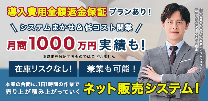 物販システム「アクセス」は世界最⼤のショッピングサイトを活⽤し、商品の登録作業や価格改定などを自動で行なうことで、売り上げが積み上がっていく新たなネット販売システムです。