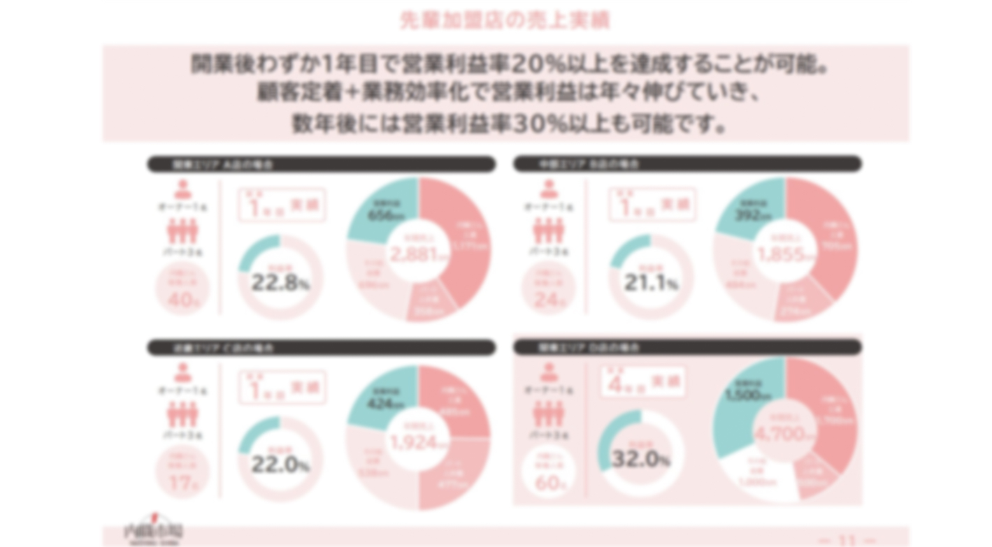開業後1年目で営業利益20%以上、数年後には30%以上も目指せるため、開業6~10ヵ月での黒字転換も実現可能です。