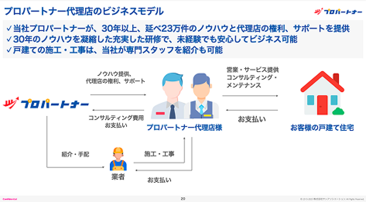 プロパートナー代理店事業は、戸建て特化の高収益ストック型ビジネス。宅建不要、加盟金・初期費用0円、月35万円~の低資金で開業可能。大手と競合せず、累計23万件の実績を持つ本部の手厚いサポートで、安定した運営が目指せます。