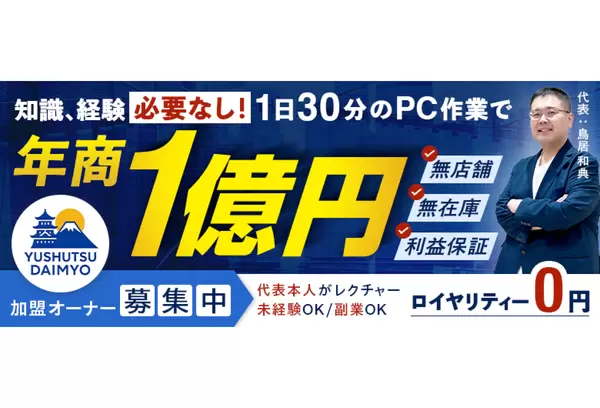 ビジネスの特徴 企業情報 説明会日程 輸出大名の説明会・面談情報 説明会・面談のポイント 輸出大名のFC説明会を開催します! 輸出大名のFC説明会では、 気になるポイントを数字ベースで分かりやすくご紹介します! ・ 初期費用&回収の目安 ・ 1日の作業イメージ ・ 黒字化までの流れ・ 市場が伸びる理由・ 選ばれるワケ ・ 加盟者の実績&プラン質疑応答もございますので、 安心してお気軽にご参加ください。 説明会を探す 開催場所 全国オンライン 開催日 未選択2025/11/19(水) 2025/11/20(木) 2025/11/21(金) 2025/11/22(土) 2025/11/23(日) 2025/11/24(月) 2025/11/25(火) 2025/11/26(水) 2025/11/27(木) 2025/11/28(金) 2025/11/29(土) 2025/11/30(日) 2025/12/1(月) 2025/12/2(火) 2025/12/3(水) 2025/12/4(木) 2025/12/5(金) 2025/12/6(土) 2025/12/7(日) 2025/12/8(月) 2025/12/9(火) 2025/12/10(水) 2025/12/11(木) 2025/12/12(金) 2025/12/13(土) 2025/12/14(日) 2025/12/15(月) 2025/12/16(火) 2025/12/17(水) 2025/12/18(木) 2025/12/19(金) 2025/12/20(土) 2025/12/21(日) 2025/12/22(月) 2025/12/23(火) 2025/12/24(水) 2025/12/25(木) 2025/12/26(金) 2025/12/27(土) 2025/12/28(日) 2025/12/29(月) 2025/12/30(火) 2025/12/31(水) 2026/1/1(木) 2026/1/2(金) 2026/1/3(土) 2026/1/4(日) 2026/1/5(月) 2026/1/6(火) 2026/1/7(水) 1428件中 1~20件を表示しています オンライン 2025年11月19日(水) 08:00〜09:00 【輸出大名】個別説明会 開催方法 申込後にURLをお送りします 申し込む オンライン 2025年11月19日(水) 09:00〜10:00 【輸出大名】個別説明会 開催方法 申込後にURLをお送りします 申し込む オンライン 2025年11月19日(水) 10:00〜11:00 【輸出大名】個別説明会 開催方法 申込後にURLをお送りします 申し込む オンライン 2025年11月19日(水) 11:00〜12:00 【輸出大名】個別説明会 開催方法 申込後にURLをお送りします 申し込む オンライン 2025年11月19日(水) 12:00〜13:00 【輸出大名】個別説明会 開催方法 申込後にURLをお送りします 申し込む オンライン 2025年11月19日(水) 13:00〜14:00 【輸出大名】個別説明会 開催方法 申込後にURLをお送りします 申し込む オンライン 2025年11月19日(水) 14:00〜15:00 【輸出大名】個別説明会 開催方法 申込後にURLをお送りします 申し込む オンライン 2025年11月19日(水) 15:00〜16:00 【輸出大名】個別説明会 開催方法 申込後にURLをお送りします 申し込む オンライン 2025年11月19日(水) 16:00〜17:00 【輸出大名】個別説明会 開催方法 申込後にURLをお送りします 申し込む オンライン 2025年11月19日(水) 17:00〜18:00 【輸出大名】個別説明会 開催方法 申込後にURLをお送りします 申し込む オンライン 2025年11月19日(水) 18:00〜19:00 【輸出大名】個別説明会 開催方法 申込後にURLをお送りします 申し込む オンライン 2025年11月19日(水) 19:00〜20:00 【輸出大名】個別説明会 開催方法 申込後にURLをお送りします 申し込む オンライン 2025年11月19日(水) 20:00〜21:00 【輸出大名】個別説明会 開催方法 申込後にURLをお送りします 申し込む オンライン 2025年11月19日(水) 21:00〜22:00 【輸出大名】個別説明会 開催方法 申込後にURLをお送りします 申し込む オンライン 2025年11月20日(木) 08:00〜09:00 【輸出大名】個別説明会 開催方法 申込後にURLをお送りします 申し込む オンライン 2025年11月20日(木) 09:00〜10:00 【輸出大名】個別説明会 開催方法 申込後にURLをお送りします 申し込む オンライン 2025年11月20日(木) 10:00〜11:00 【輸出大名】個別説明会 開催方法 申込後にURLをお送りします 申し込む オンライン 2025年11月20日(木) 11:00〜12:00 【輸出大名】個別説明会 開催方法 申込後にURLをお送りします 申し込む オンライン 2025年11月20日(木) 12:00〜13:00 【輸出大名】個別説明会 開催方法 申込後にURLをお送りします 申し込む オンライン 2025年11月20日(木) 13:00〜14:00 【輸出大名】個別説明会 開催方法 申込後にURLをお送りします 申し込む 1 2 3 4 5 6 7 8 次の20件 このフランチャイズと似た条件の本部 冷凍自販機 グルメスターズ その他・各種小売 開業資金:0 万円 エディオン家電販売サポート その他・各種小売 開業資金:10 万円 クラウドファンディングビジネス その他・各種小売、IT・通信・情報・携帯電話、ネットショップ 開業資金:50 万円 健康食品の販売代理店 その他・各種小売 開業資金:20 万円 輸出大名と同じ条件から、フランチャイズ本部を探す 予算が同じ 0~100万円 業種が同じ 小売 その他・各種小売 都道府県が同じ 北海道 青森県 岩手県 宮城県 秋田県 山形県 福島県 茨城県 栃木県 群馬県 埼玉県 千葉県 東京都 神奈川県 新潟県 富山県 石川県 福井県 山梨県 長野県 岐阜県 静岡県 愛知県 三重県 滋賀県 京都府 大阪府 兵庫県 奈良県 和歌山県 鳥取県 島根県 岡山県 広島県 山口県 徳島県 香川県 愛媛県 高知県 福岡県 佐賀県 長崎県 熊本県 大分県 宮崎県 鹿児島県 沖縄県 テーマが同じ 未経験からオーナーに 研修・サポートが充実 無店舗型のビジネス 在庫なしで低リスク 年収1000万を目指せる